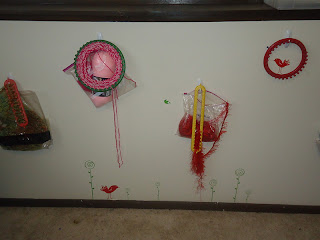 My favorite idea I had, hooks on the wall under the ledge for all my knitting looms. They are just those command hooks that are stuck to the wall, so I could easily pull them off and move them if I want. It is nice to be reminded that I need to finish all those projects (well the pink yarn on the green loom is Sariah's first project, she's making herself a hat.) I love the little red bird that lives in the red loom, too.
